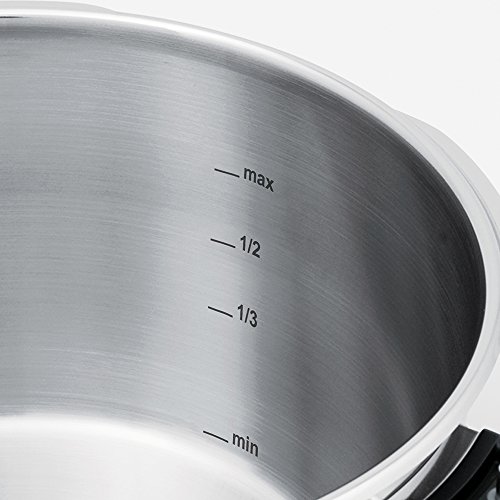 Durch eine Metalllasche am Deckel gelingt das Aufsetzen des Deckels ganz einfach. Und mit dem neu gestalteten Topfrand funktioniert auch das Schließen reibungslos. Wurde der Topf richtig geschlossen, ist ein „Klick“ hörbar. Erst jetzt kann Druck aufgebaut werden. Der Schnellkochtopf vitaquick verfügt über zwei Garstufen. Mit dem superthermic-Boden ist der Schnellkochtopf vitaquick für jeden Herd geeignet. Der Topf wird schnell, gleichmäßig und energiesparend erhitzt. Die praktische Füllstandsanzeige an der Topfinnenwand zeigt die minimale und maximale Flüssigkeitsmenge an. Der abnehmbare Griff macht vitaquick Schnellkochtöpfe einfach zu reinigen und ineinander stapelbar.